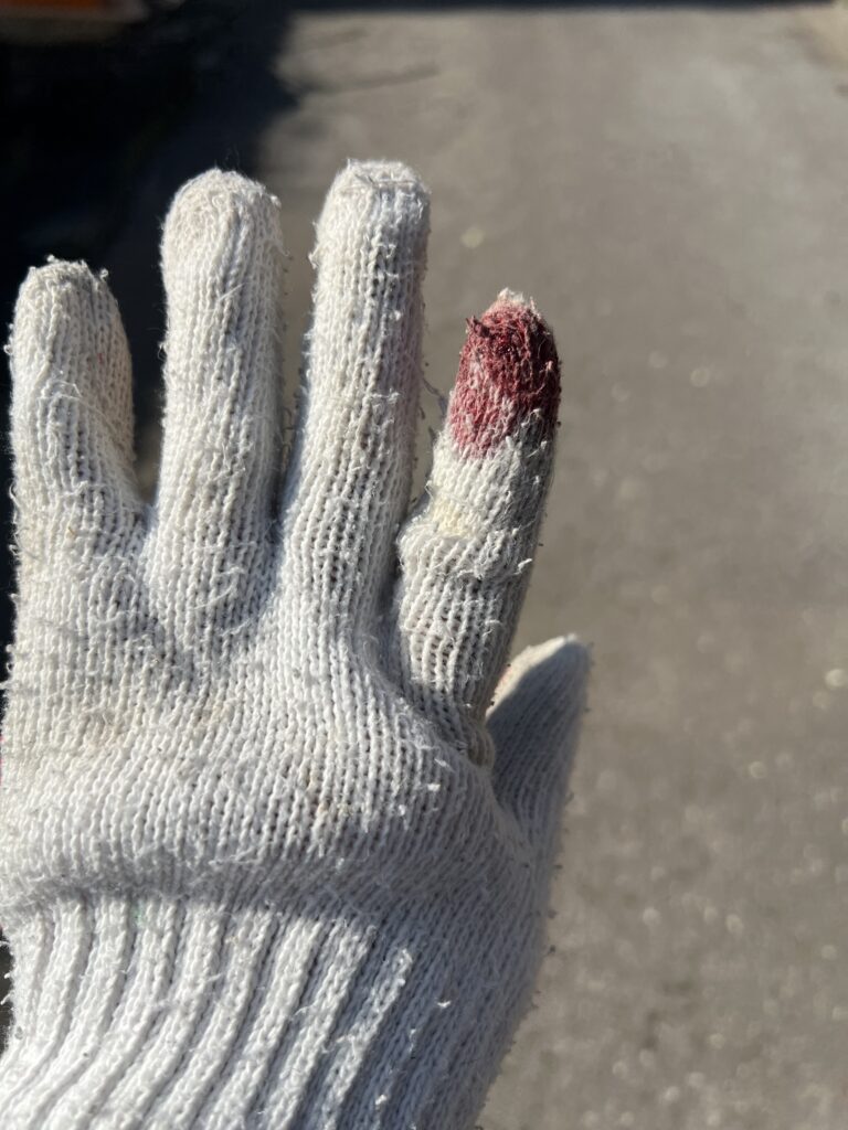ということで、馬がカッカして顔をこちらに向けた先に左手に纏めた引き手をガブッとやりまして、その束の中に私の指があり、なんかめちゃくちゃ痛いなぁと思ったら軍手に血がついていました。